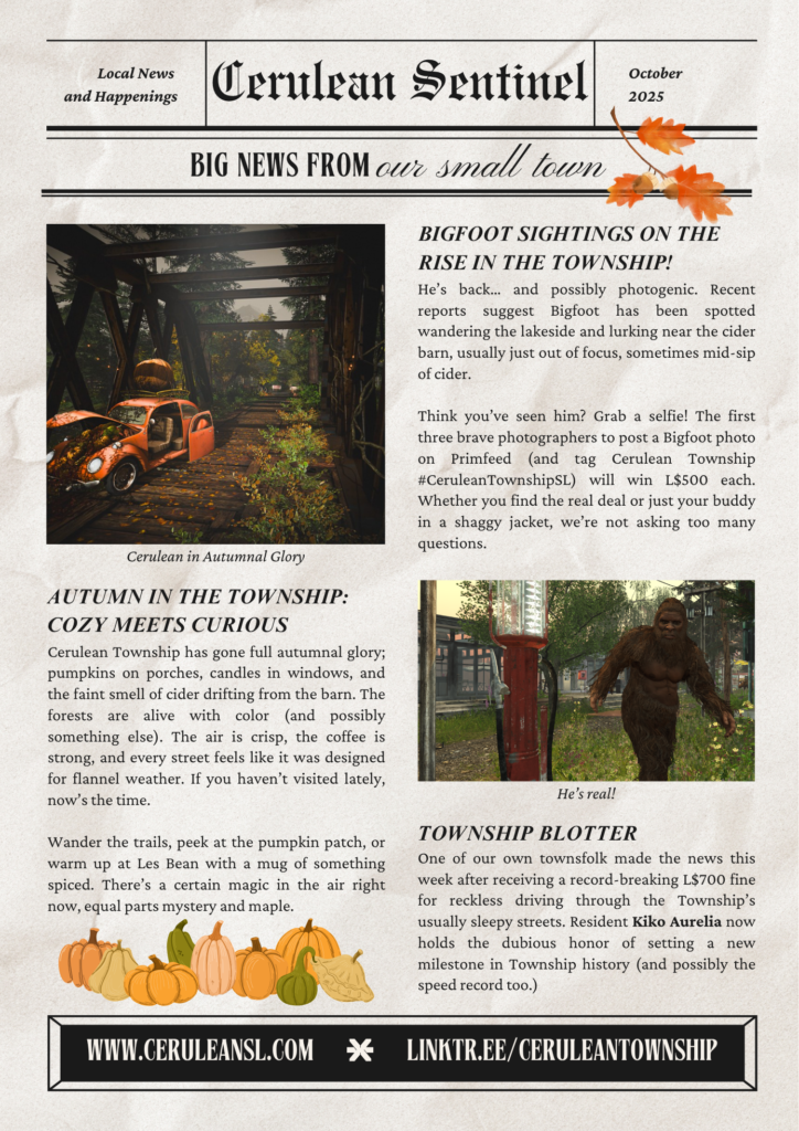 The October edition of the Cerulean Sentinel dives into the latest local buzz, reports of Bigfoot wandering the lakeside (possibly mid-sip of cider), the township wrapped in full autumnal glory, and one resident setting a new record for reckless driving fines.